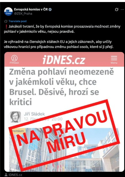 Strategické materiály Evropské komise zůstávají často mimo zájem národních mainstreamových médií. Jinak je tomu v případě Strategie LGBTIQ+ rovnosti pro roky 2026 – 2030 (Strategie) vydané Evropskou komisí. Média zaujala pasáž věnující se úřední změně pohlaví, kde Komise uvádí, že podporuje změnu pohlaví, která nebude vázána na lékařskou diagnózu, ale spíše na pohlavní sebeidentifikaci bez omezení věku (tedy i na děti). Když se z toho stalo téma, Stálé zastoupení Evropské komise v ČR začalo tento výklad mohutně popírat.